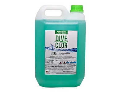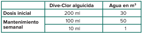 Una vez por semana, diluir los ml necesarios de Dive-Clor Alguicida en un recipiente, para luego incorporar a la piscina: