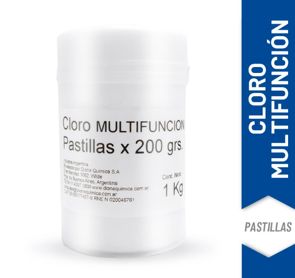 Paquete de 1kg de pastillas. Son 5 pastillas de 200g c/u. Triple acción: aporta la dosis justa de ácido hipocloroso, alguicida y clarificador.